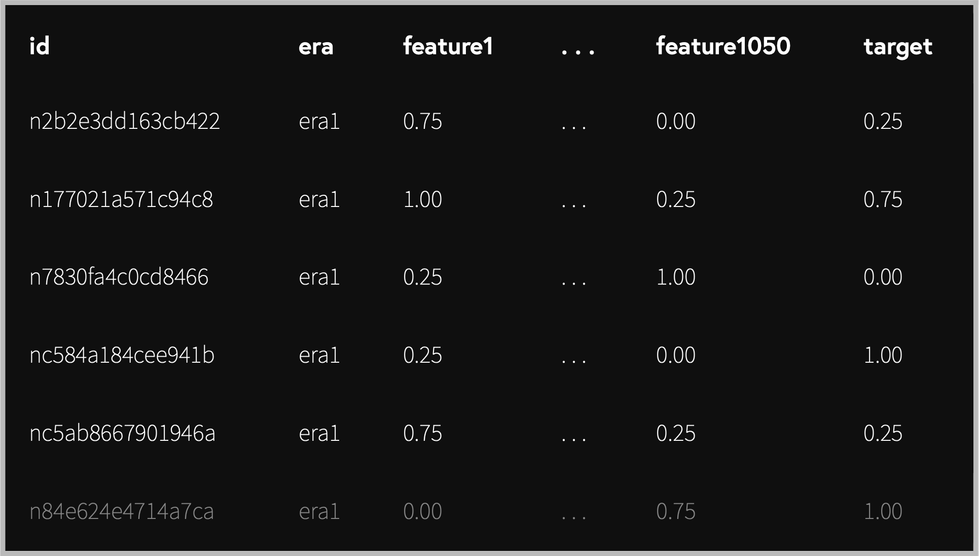 Each id corresponds to a stock at a specific time era. The features describe the various quantitative attributes of the stock at the time. The target represents an abstract measure of performance a fixed number of weeks into the future.